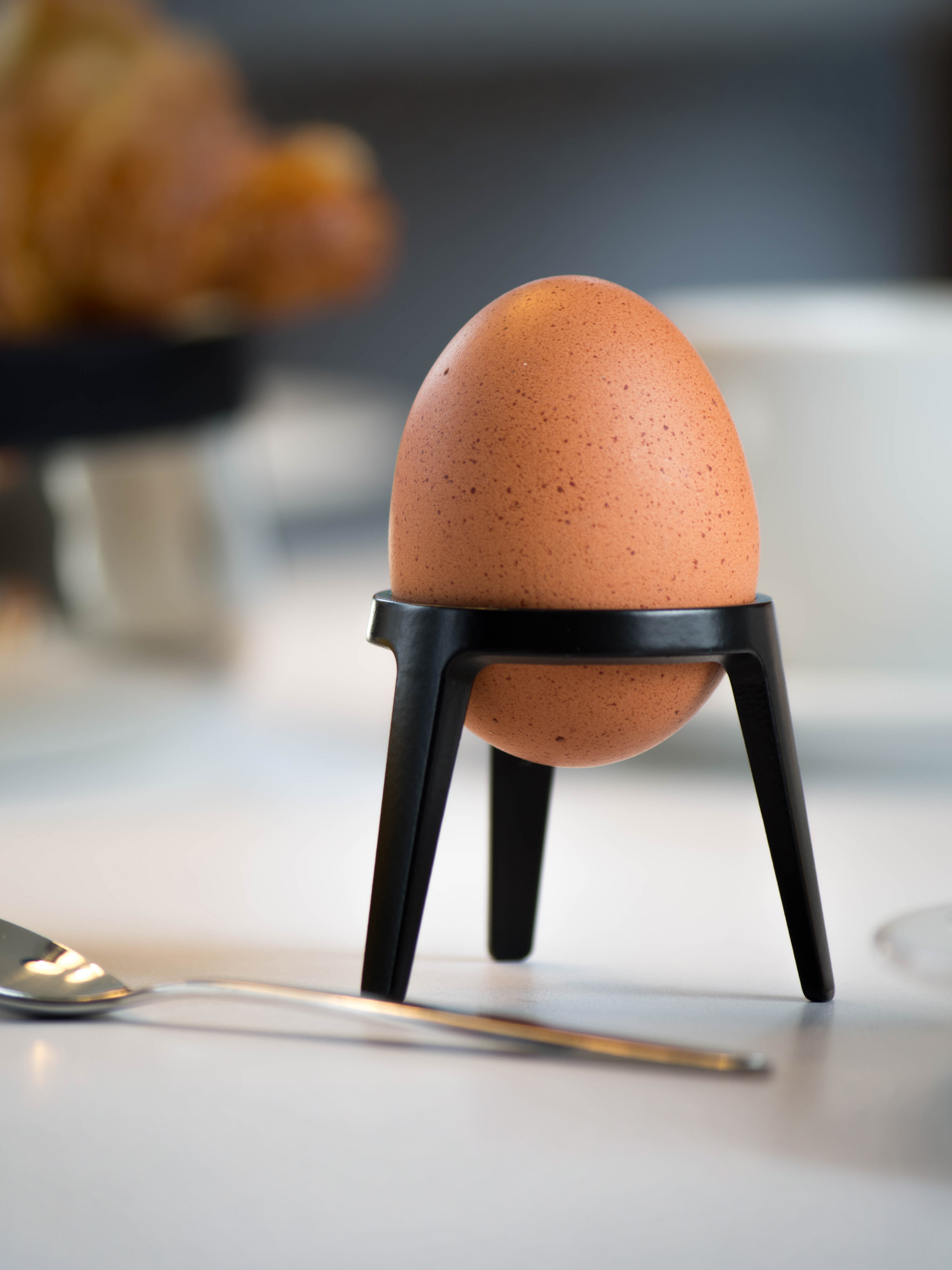 Die wohl eleganteste Art Ihr Frühstücksei zu genießen. Hergestellt aus Metall, bruchsicher, stapelbar und spülmaschinenfest. Die Formensprache und das Design sind so logisch, schlicht und reduziert, wie ein Ei selbst. Alles was es braucht um ein Frühstücksei zu halten ist ein Ring - dieser sitzt auf einem Dreibein um größtmögliche Stabilität zu gewährleisten. Mehr ist nicht nötig.